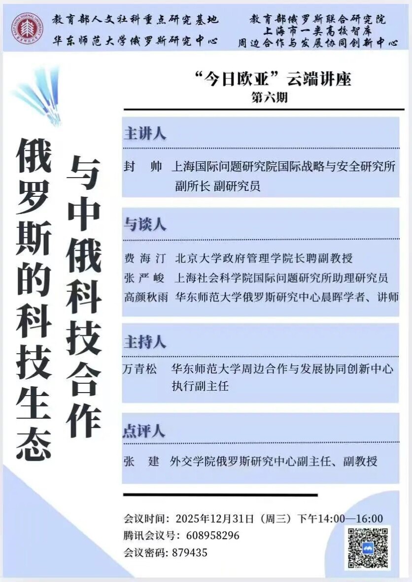 12月31日,周边中心联合主办的“今日欧亚”第六期线上讲座“俄罗斯的科技生态与中俄科技合作”成功举行,来自校内外70余位听众线上参会。讲座由周边中心执行副主任万青松主持,中心主任冯绍雷致辞。