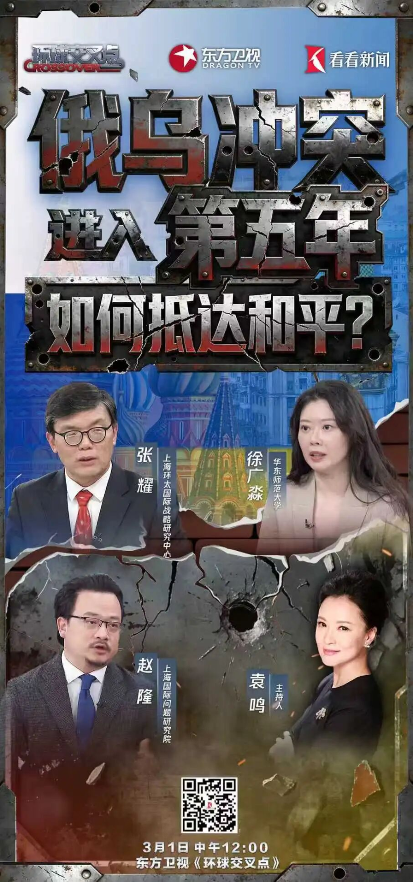 3月1日中午12点,东方卫视《环球交叉点》节目,探讨迈向第五年的俄乌冲突局势与和谈前景,俄罗斯研究中心副教授徐广淼将参加该节目。